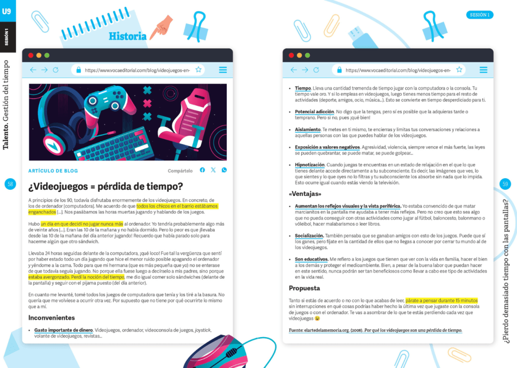 Hay una actividad individual y una para realizar en grupo: test, entrevistas, diálogos, mapas, preguntas, juegos…